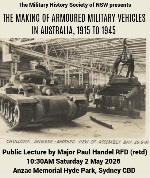 Saturday, 2 May 2026, 10:30AM-11:30AM, Auditorium, Anzac Memorial Hyde Park, corner Elizabeth and Liverpool Streets, Sydney CBD. Admission is free of charge but a donation would be appreciated. For further information call 0419 698 783 or email: president@militaryhistorynsw.com.au.